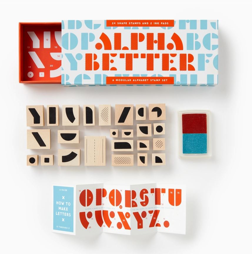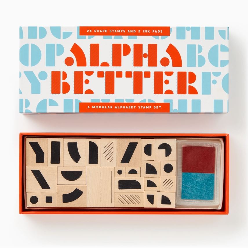 STAMP SET - This rubber stamp kit includes a series of geometric shaped stamps, a two-color stamp pad, and a guide explaining how to build a beautiful retro-inspired font. It’s perfect for marking envelopes, labeling gifts, or writing out that ransom letter that you’ve been putting off.