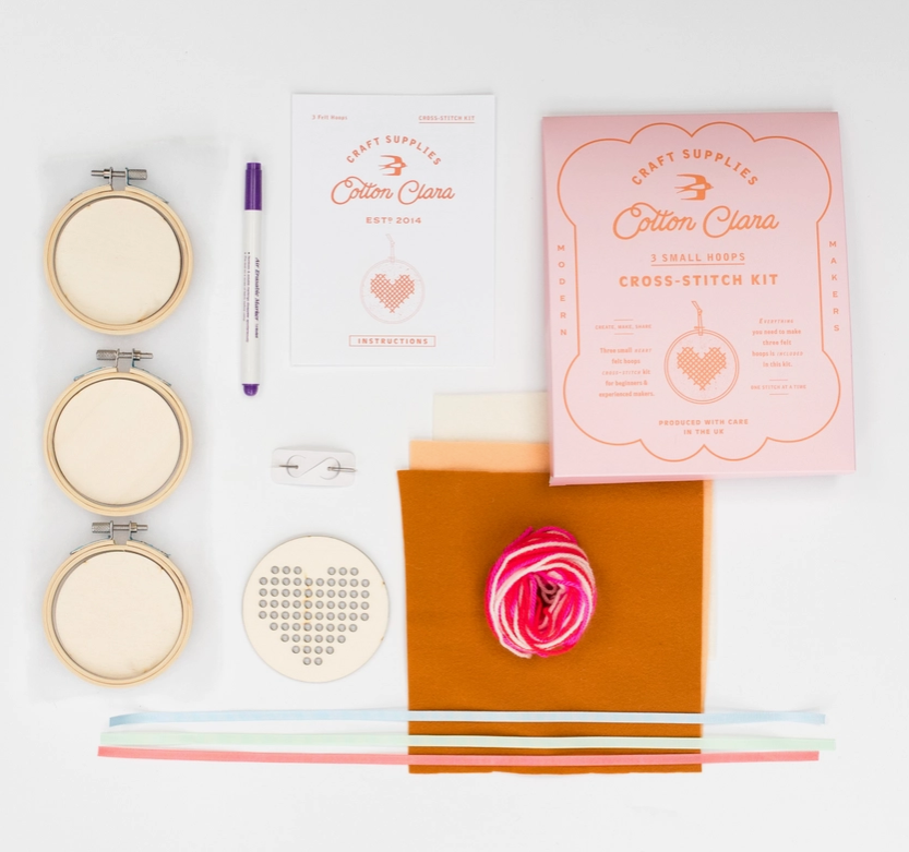 - Everything required to complete this kit is included: hoops, fabric (cream, rust, peach), thread (pink, cream, red), needle, wooden template, erasable embroidery pen, ribbon to hang, backing disc, wadding and instructions.