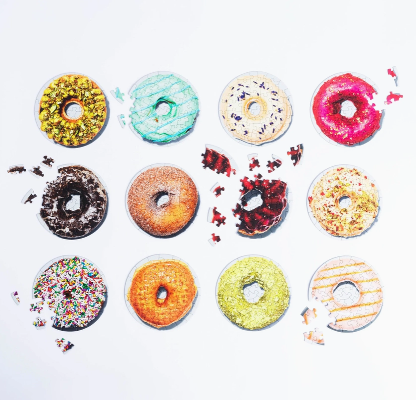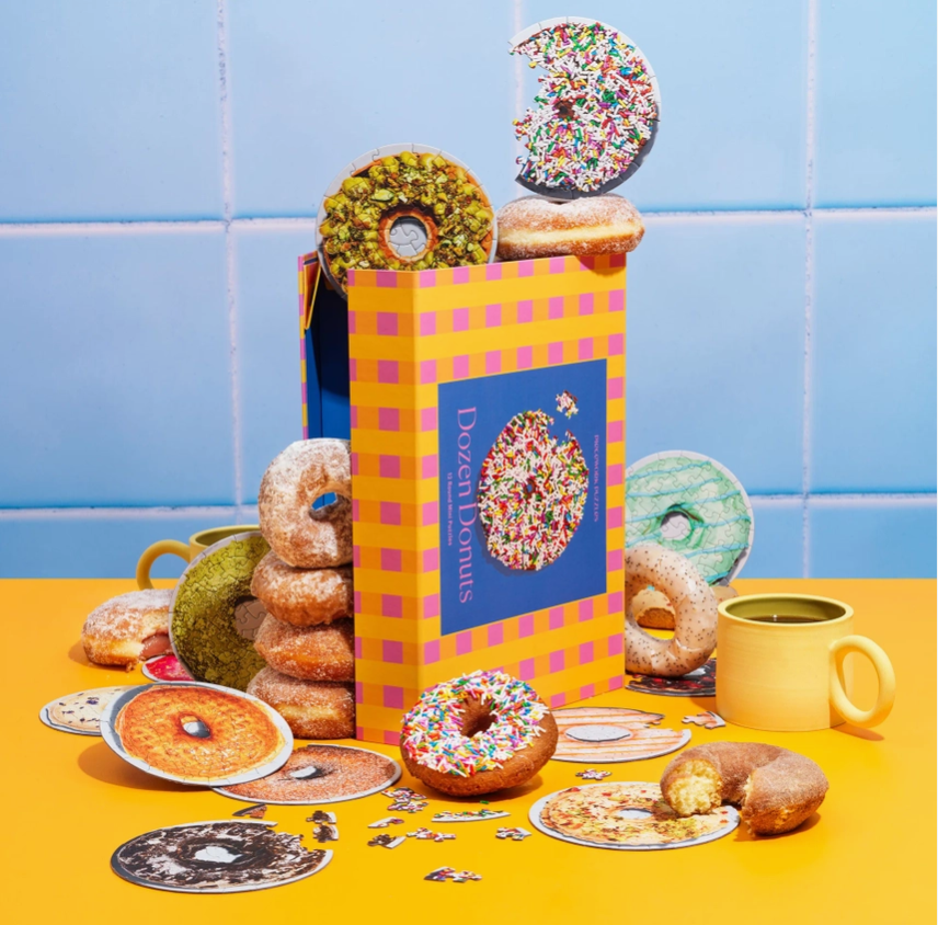 Snack on this! Dozen Donuts is a collection of 12 round mini puzzles. Each bite-sized mini is 5 inches across and includes 45 jigsaw pieces. The box is over-the-top cute, and the puzzles look good enough to eat.
